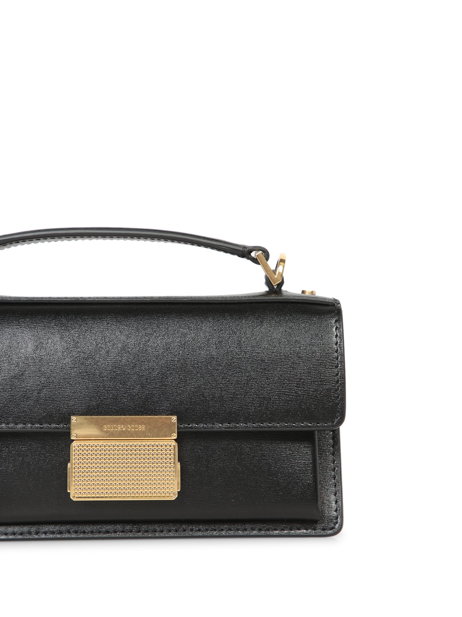 Elegant Golden Goose Venezia Small bag, featuring sleek black leather texture with golden accents and a structured design. Perfect for adding a luxurious yet functional touch to your everyday style.