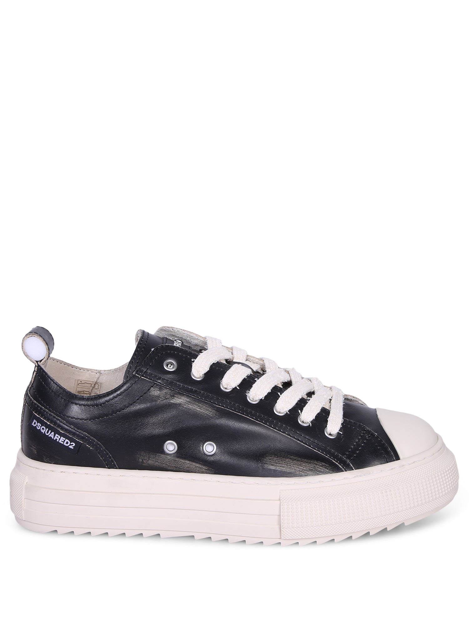 Black leather sneakers. Raised rubber sole. White lace-up closure.