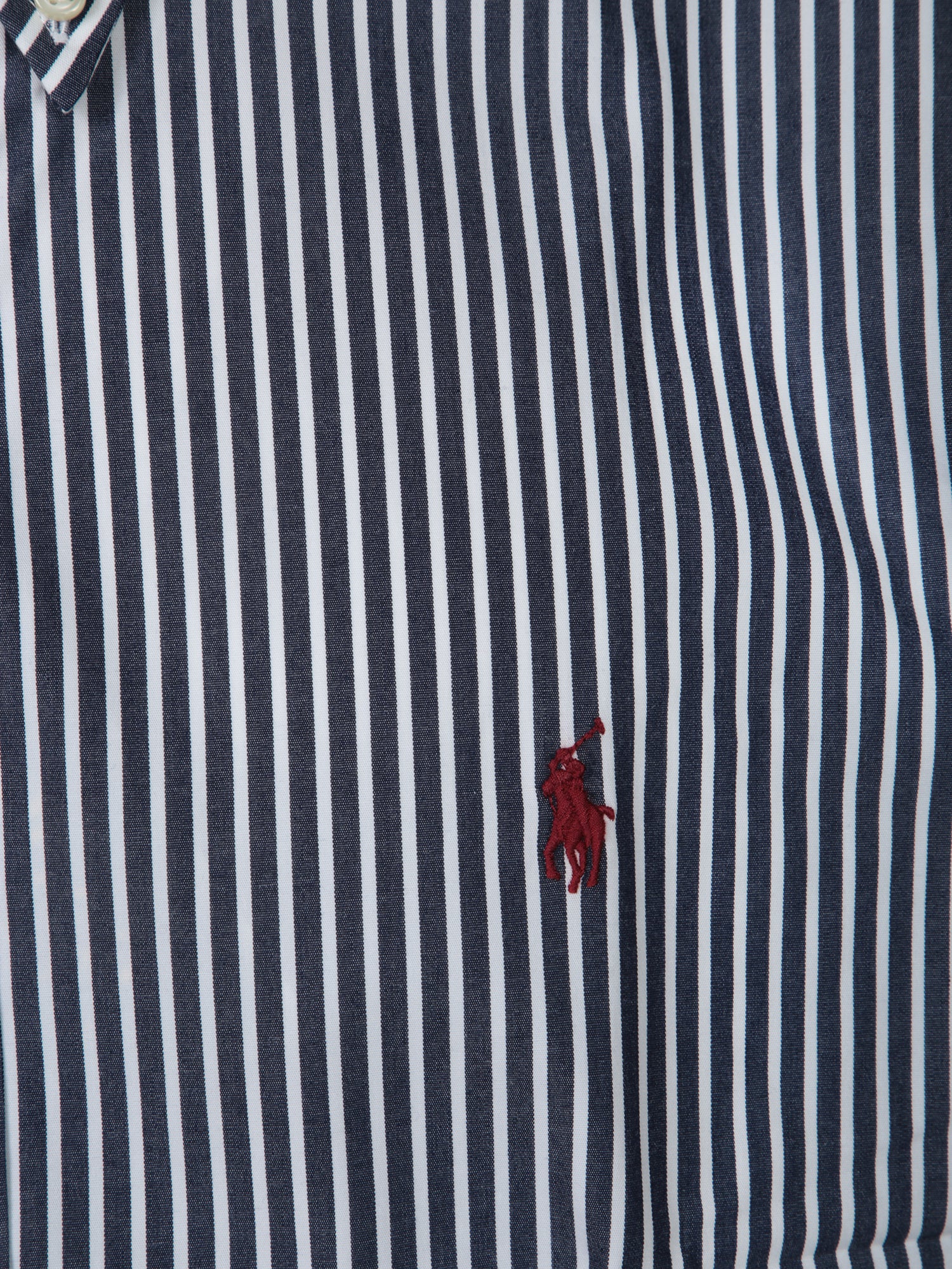 Long sleeves, button-down collar, front button closure, embroidered logo on the chest.