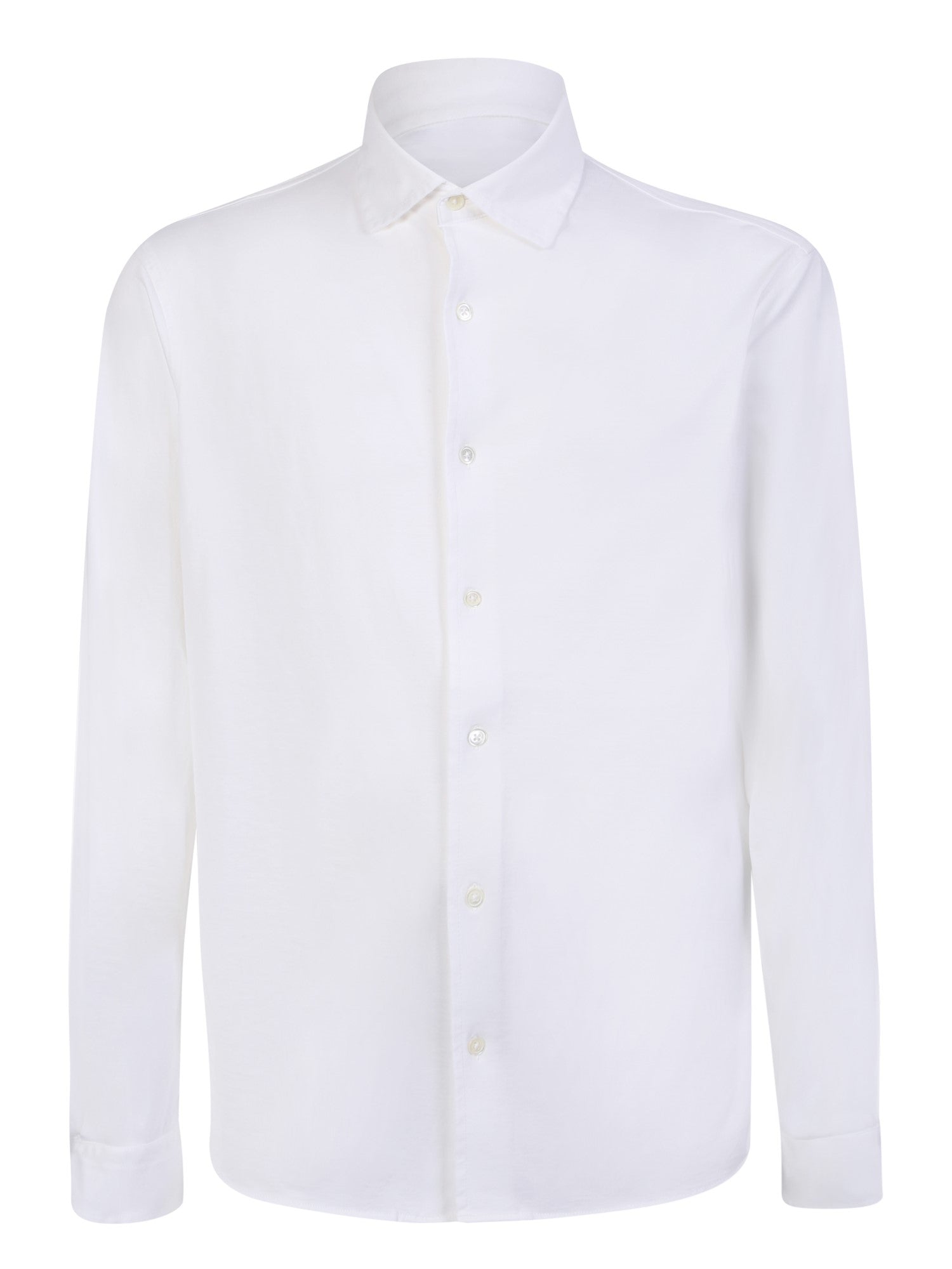 White dyed jersey shirt by Dell'Oglio; the meeting of classic elegance and inform materials defines the timeless style of this garment