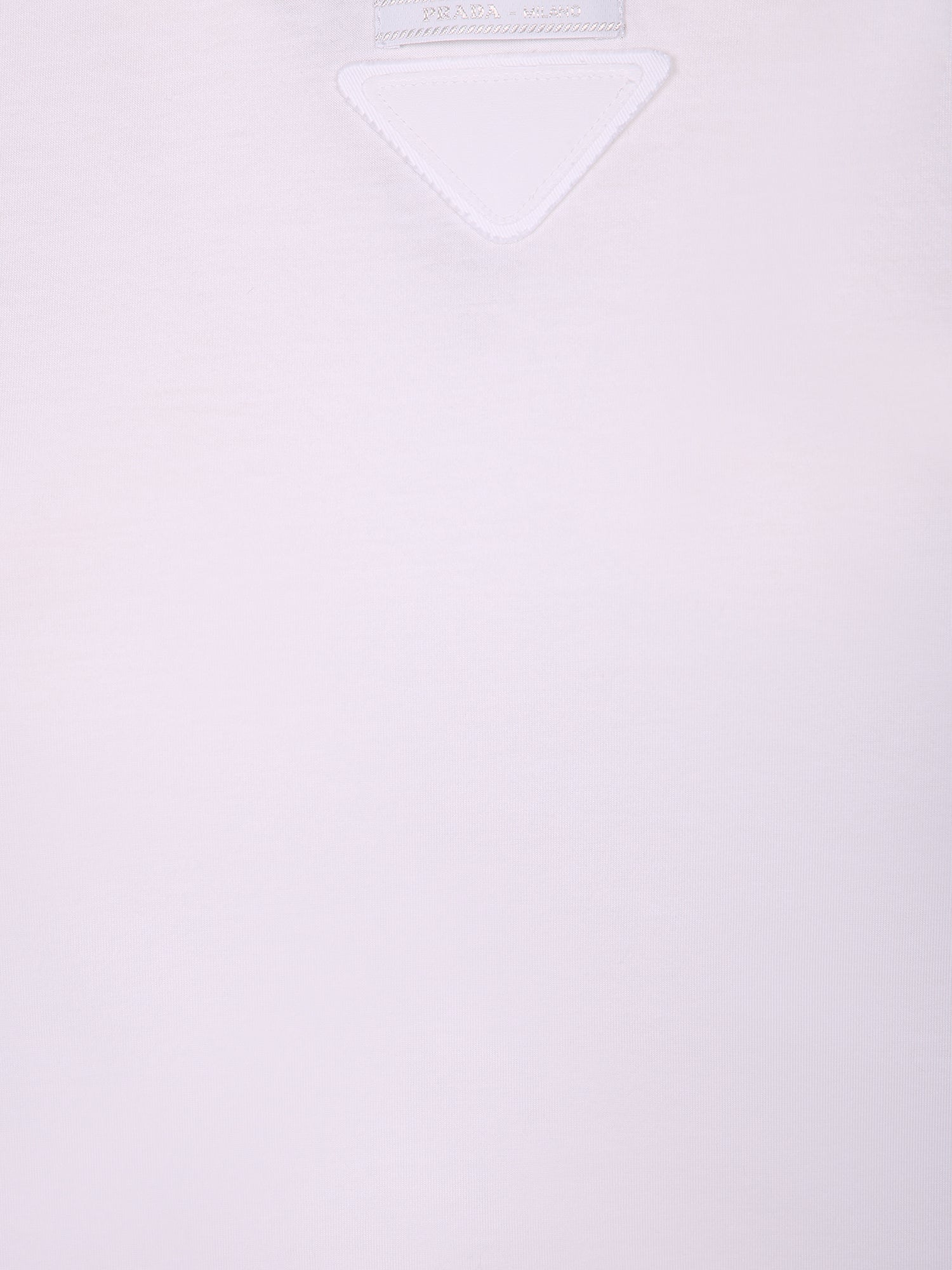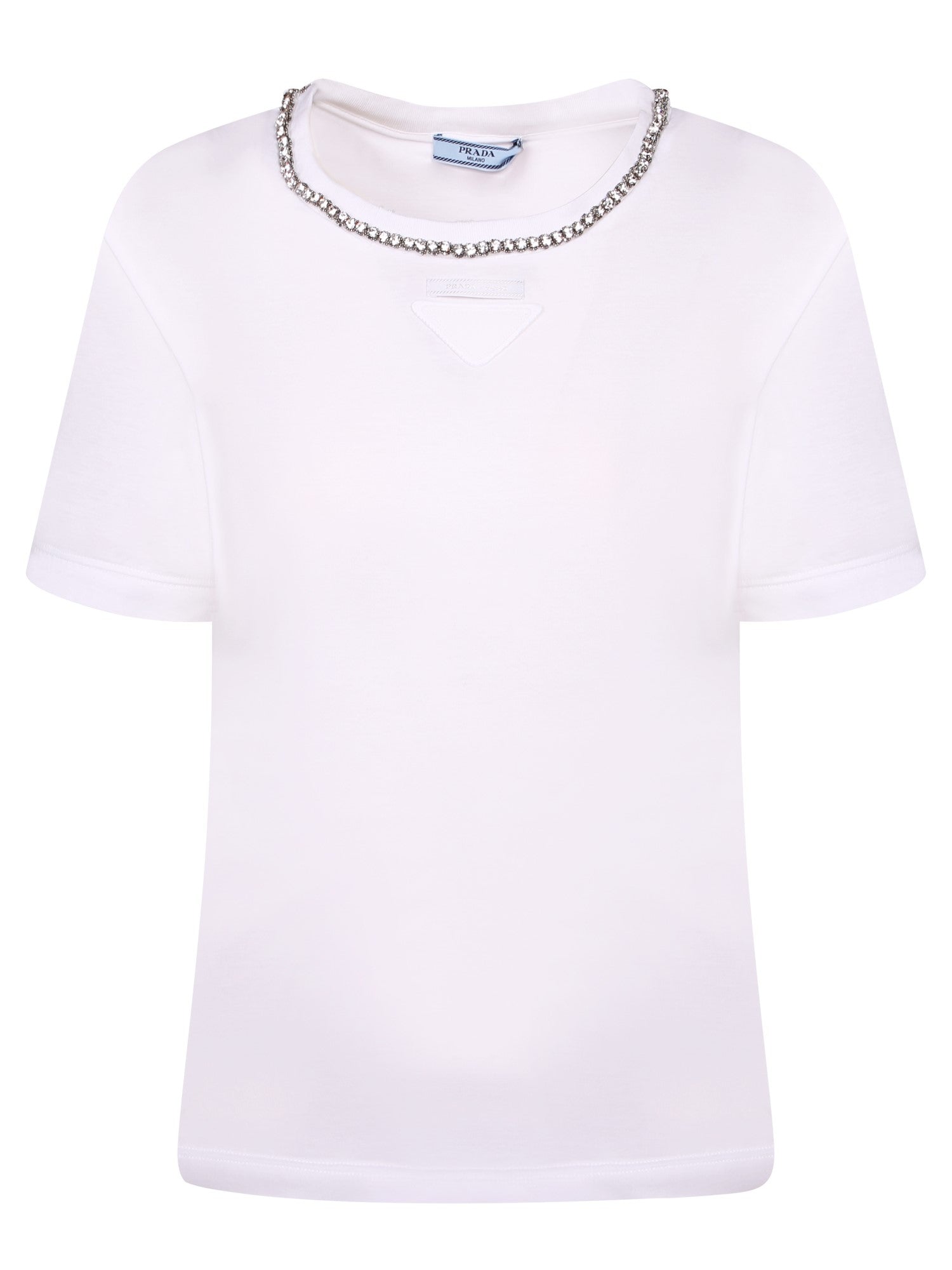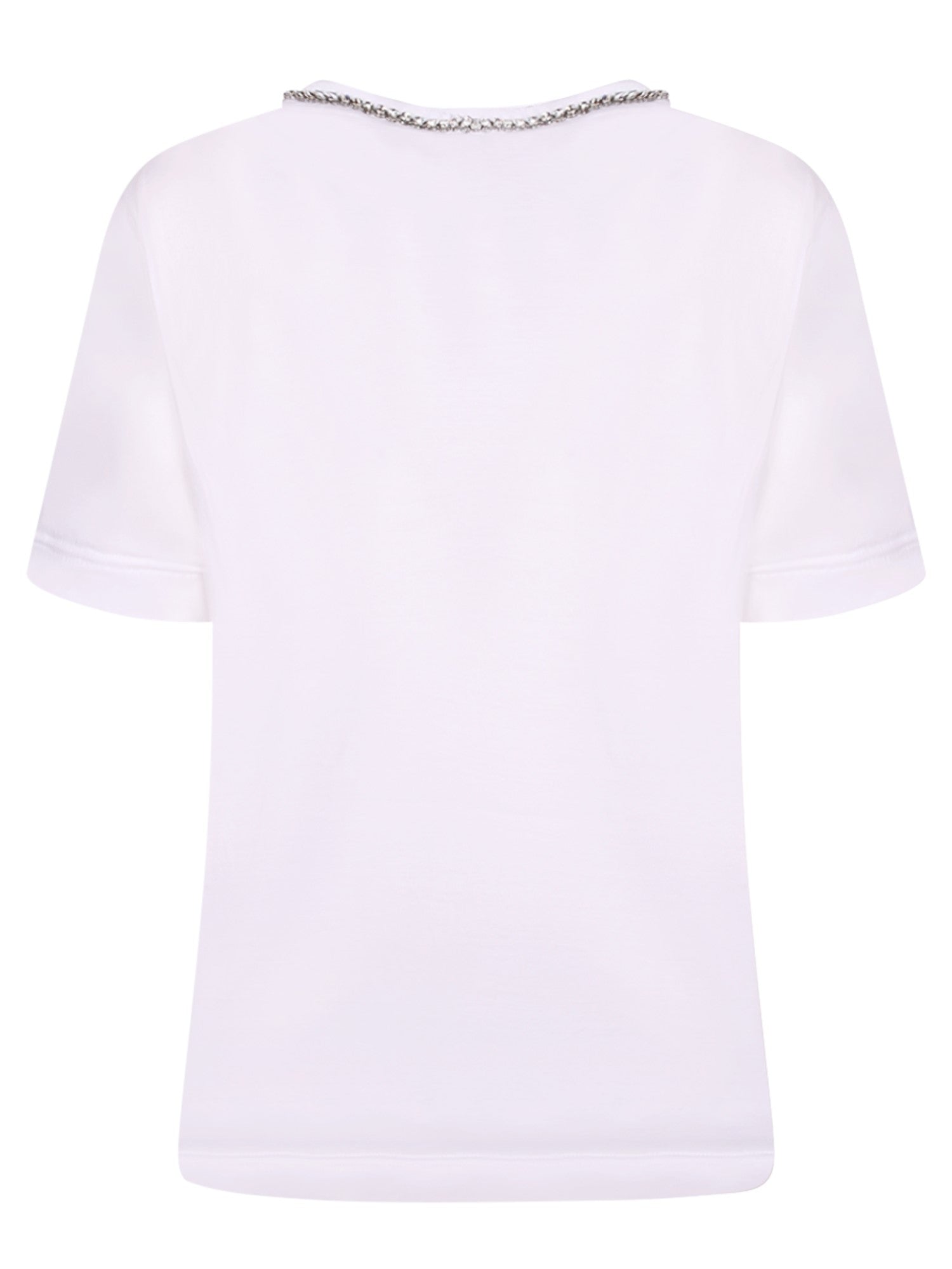 Short sleeve white T-shirt with chain detail and embroidered triangle logo on the chest.