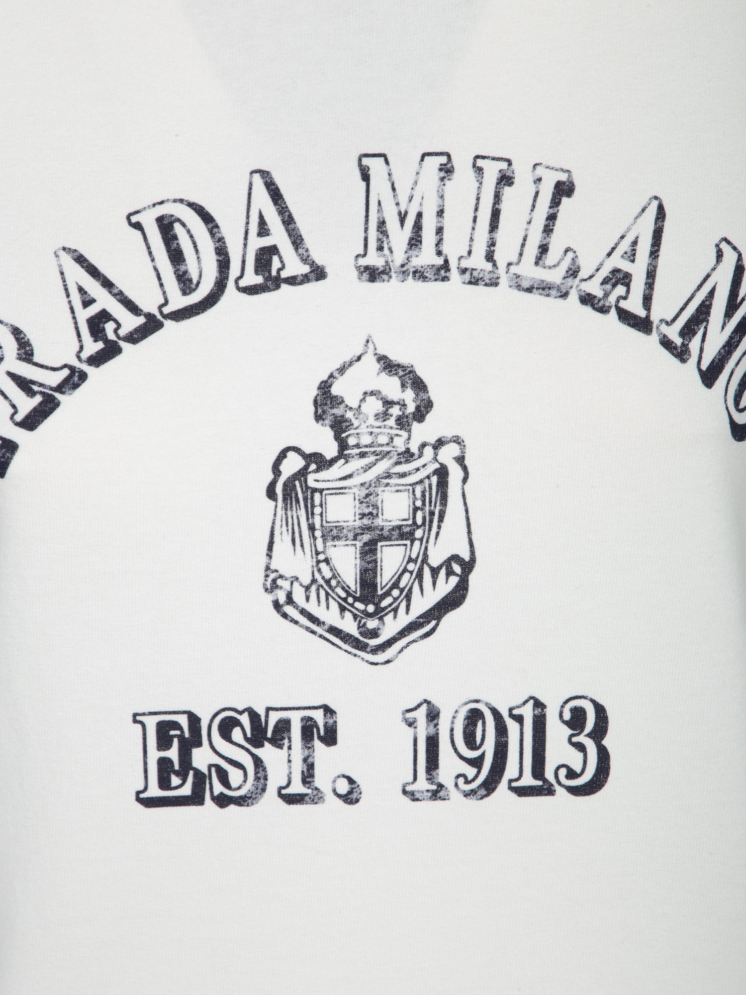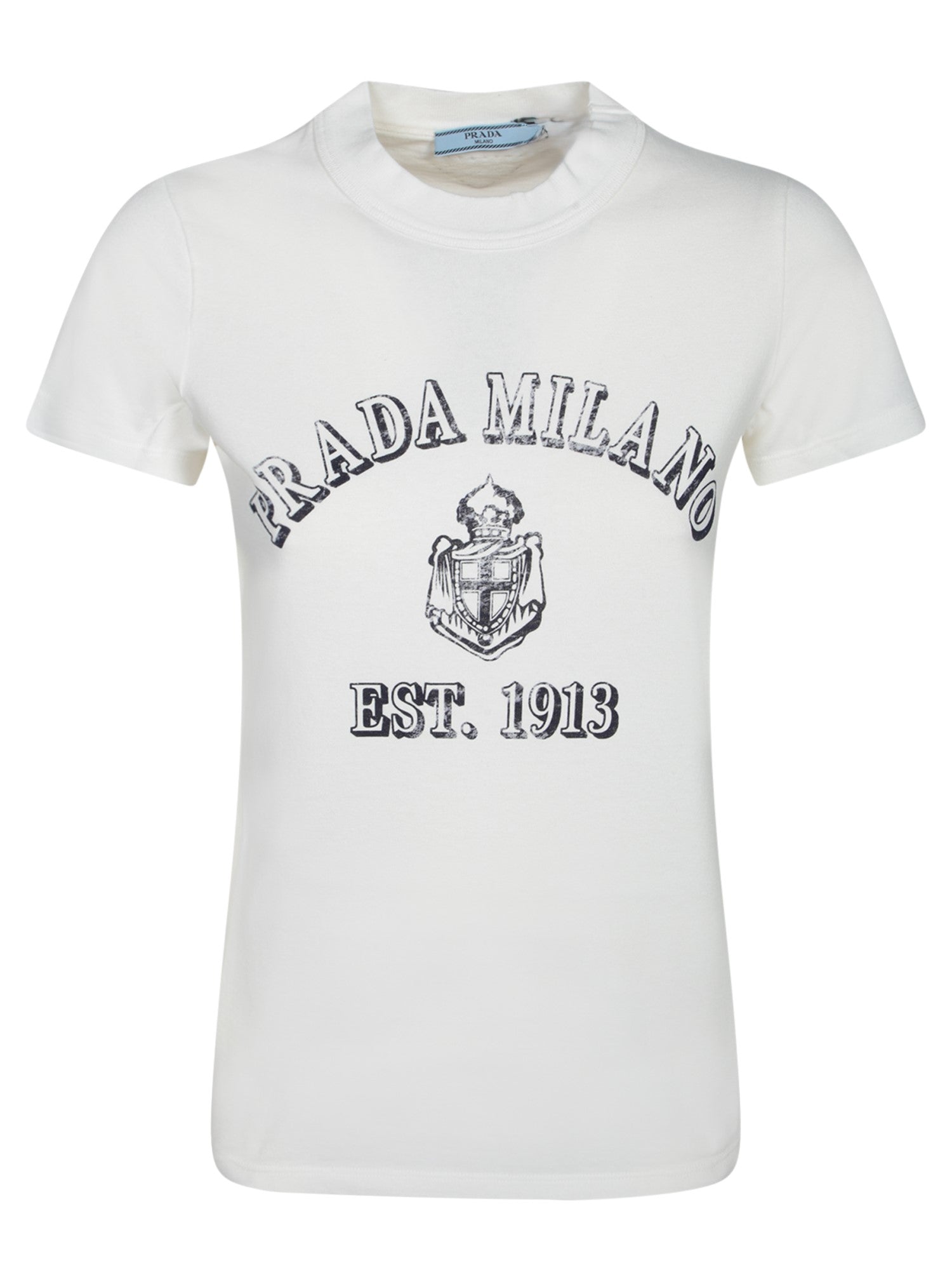This white jersey t-shirt by Prada features an elegant print of the logo and founding date, blending comfort and luxury in a timeless design.