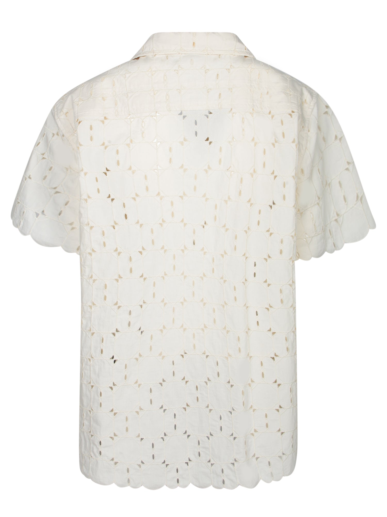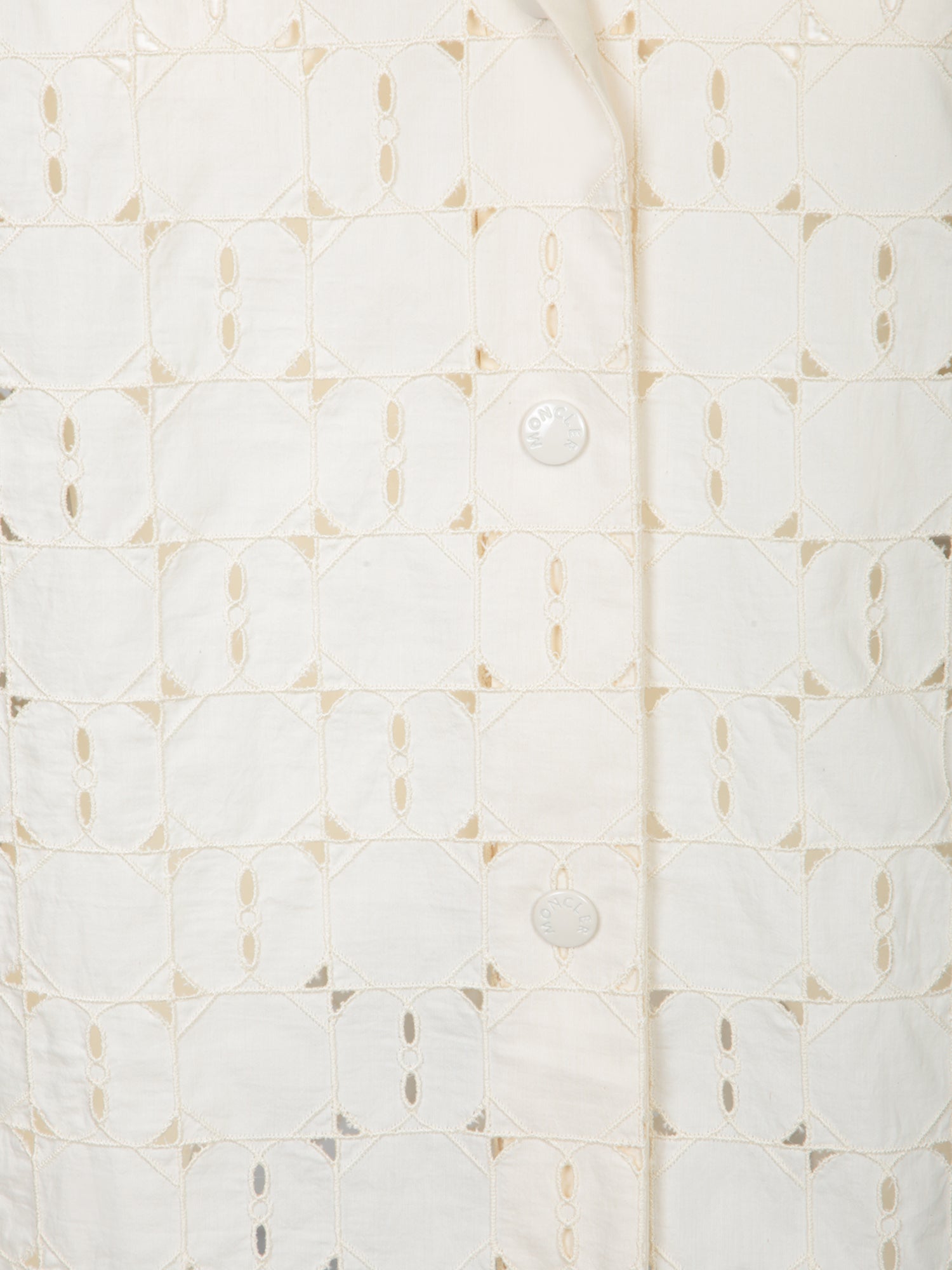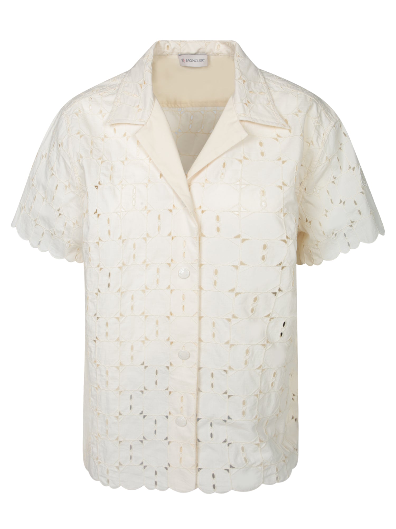 The Moncler Sangallo Shirt in pure white embodies tailored elegance with intricate sangallo detailing, providing a refined texture and a sophisticated look.