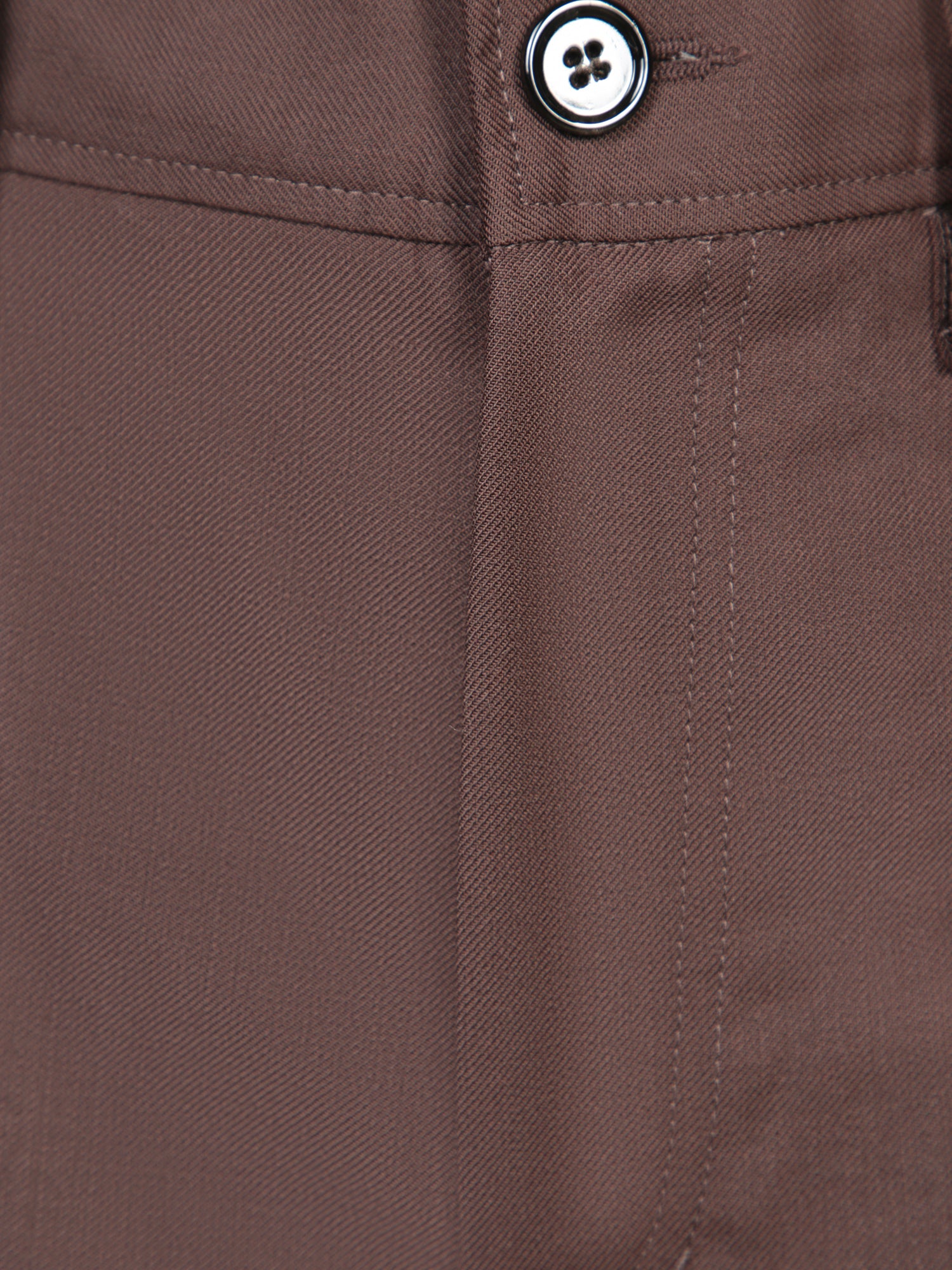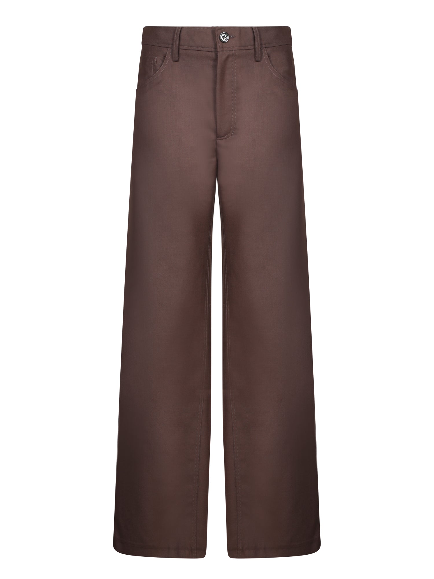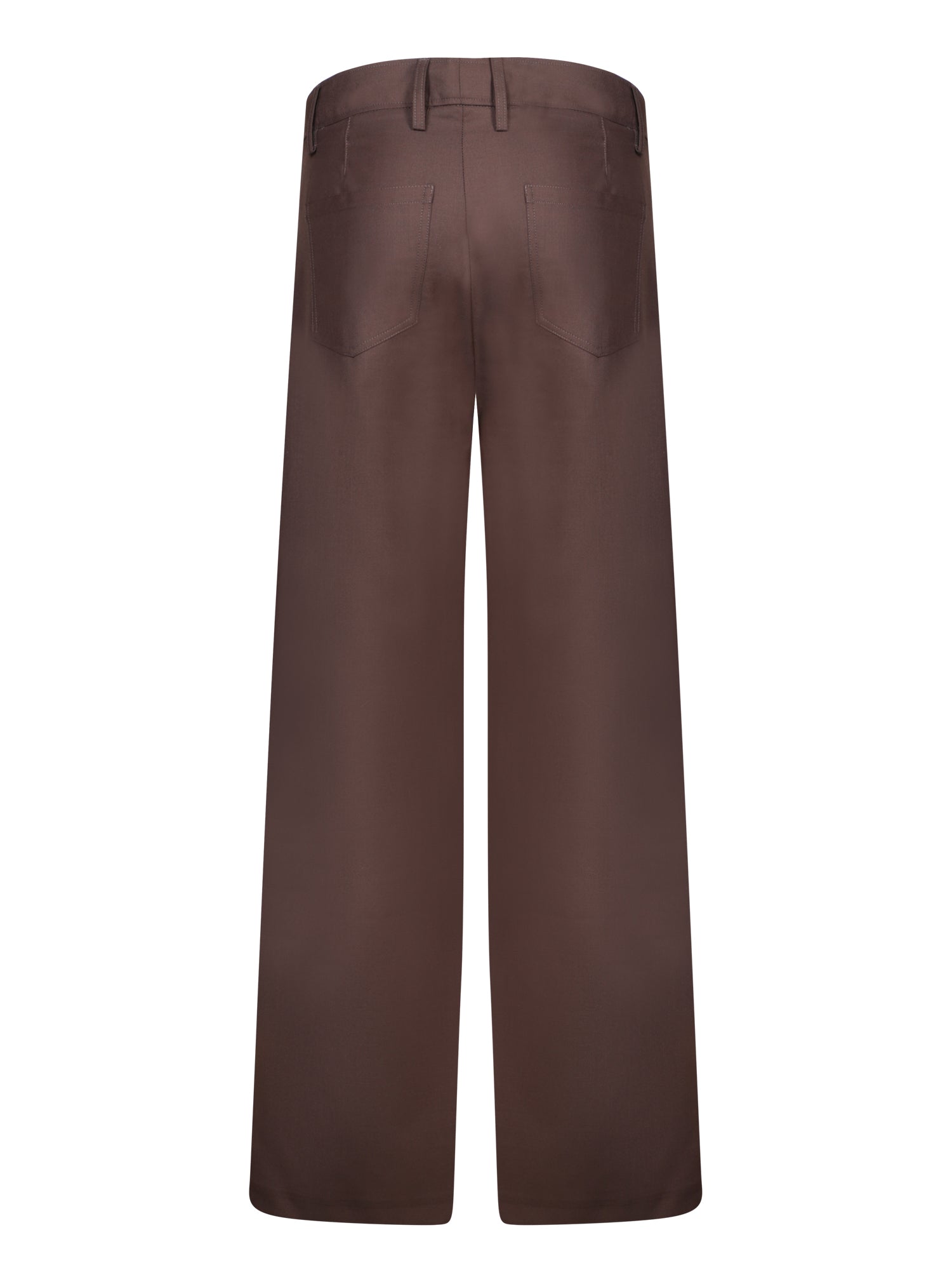 Wide-leg model. Made from smooth fabric. Uniform brown color.