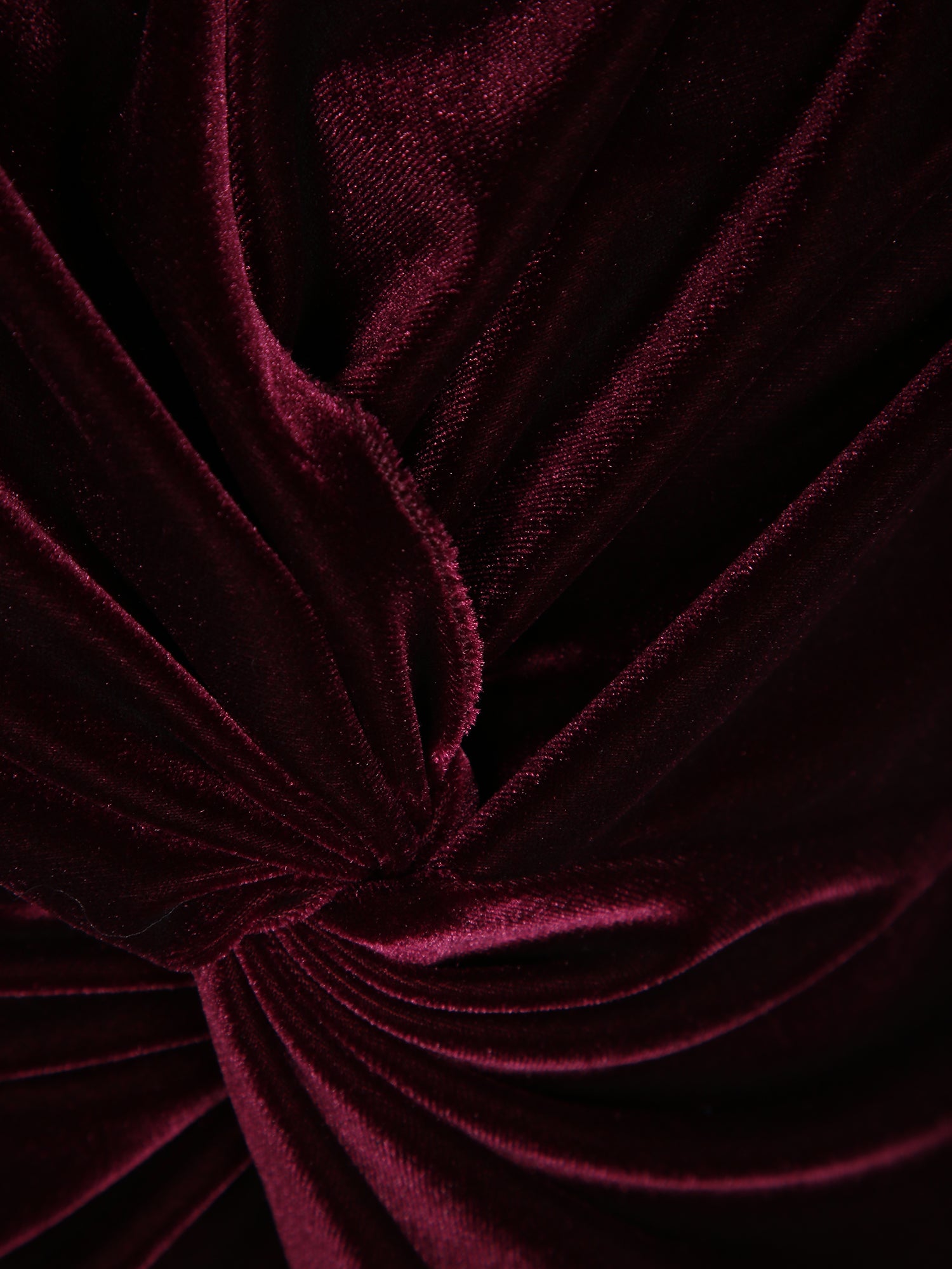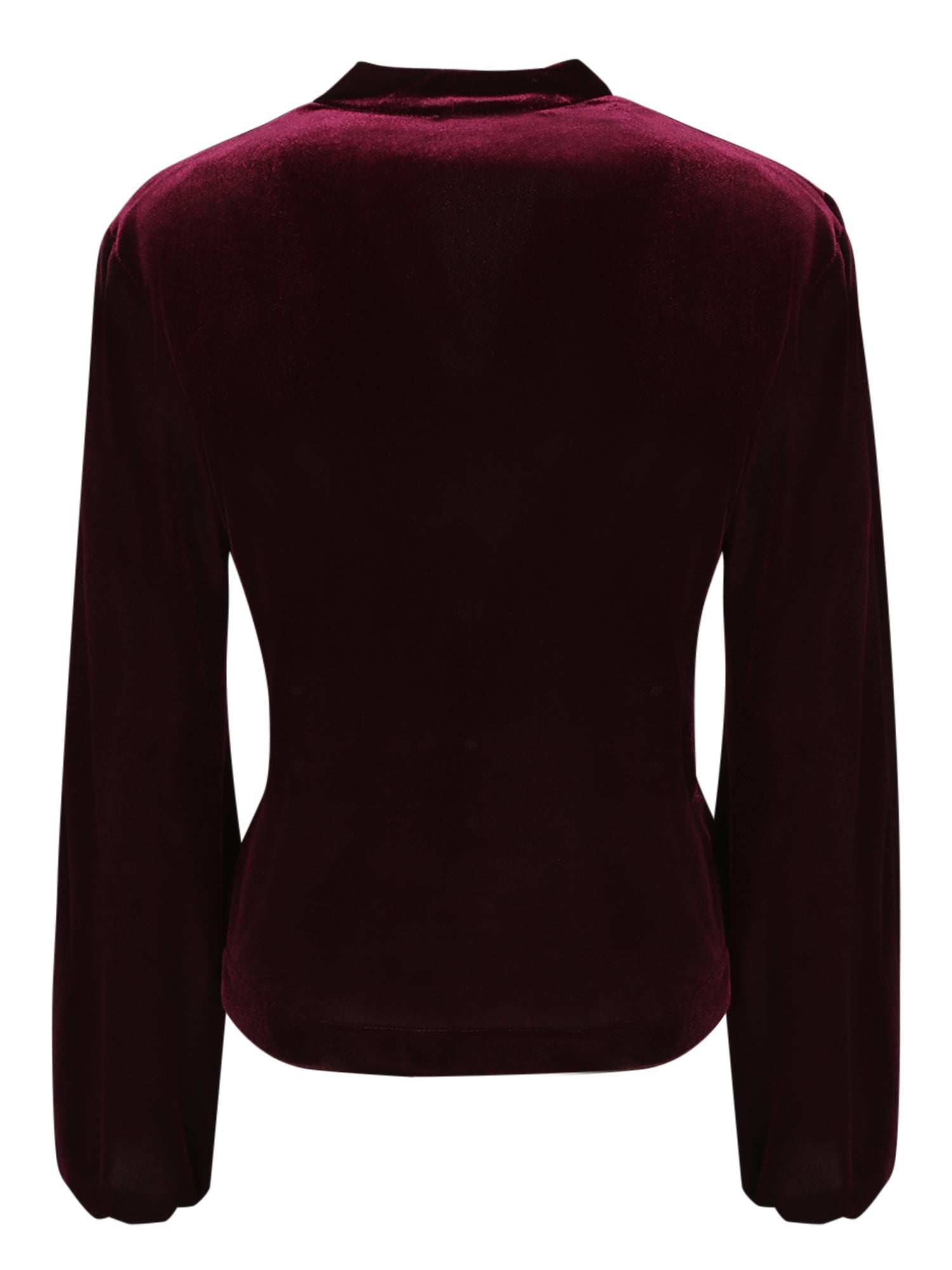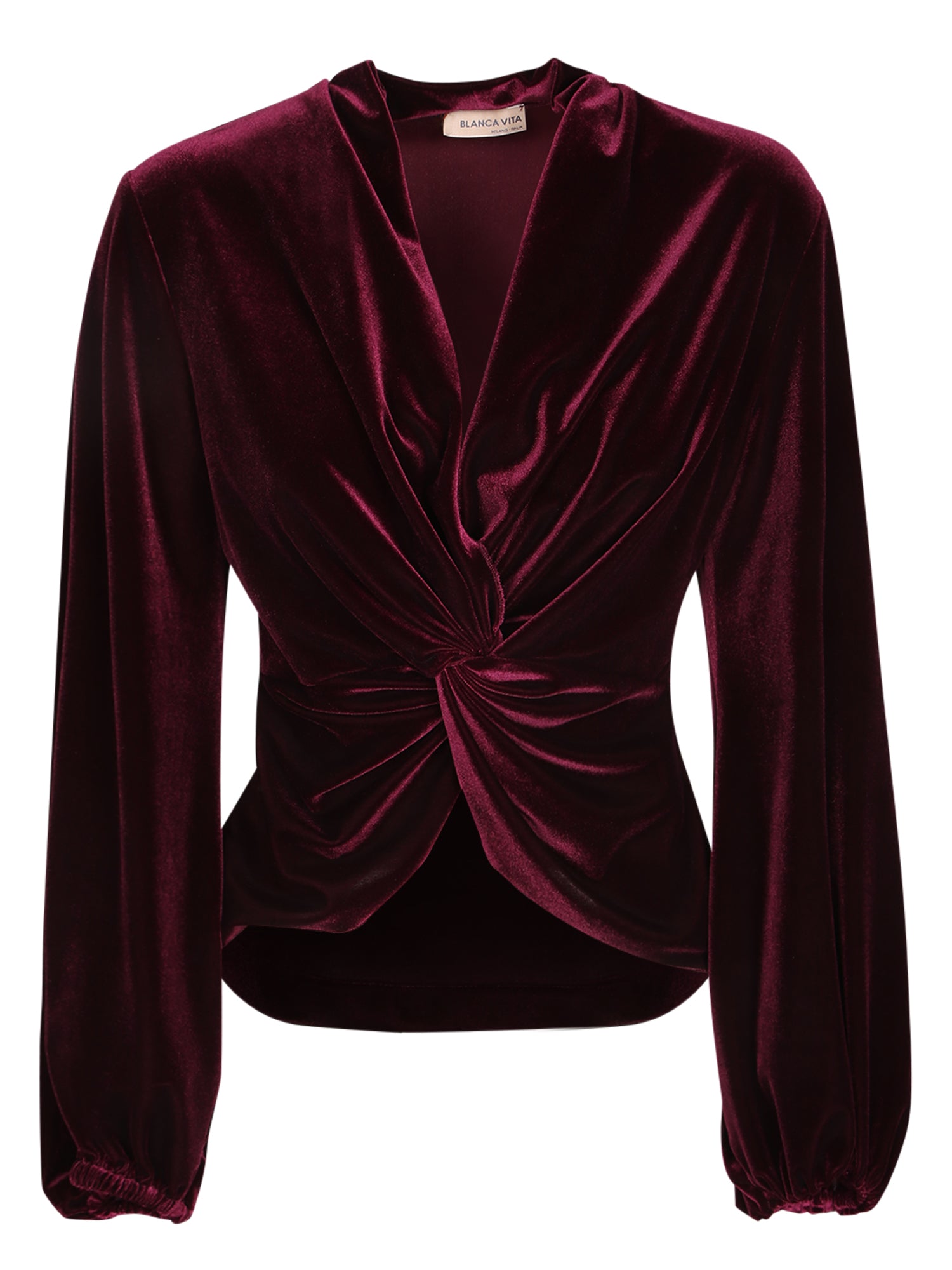 Velvet blouse with front knot, long sleeves, and V-neckline.