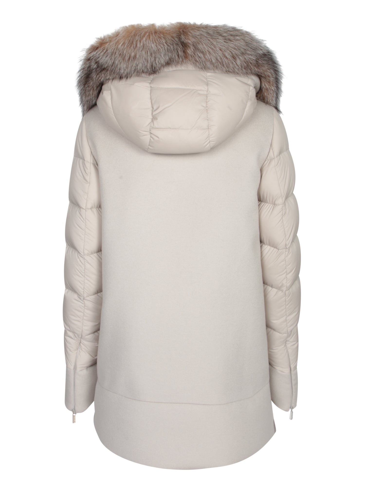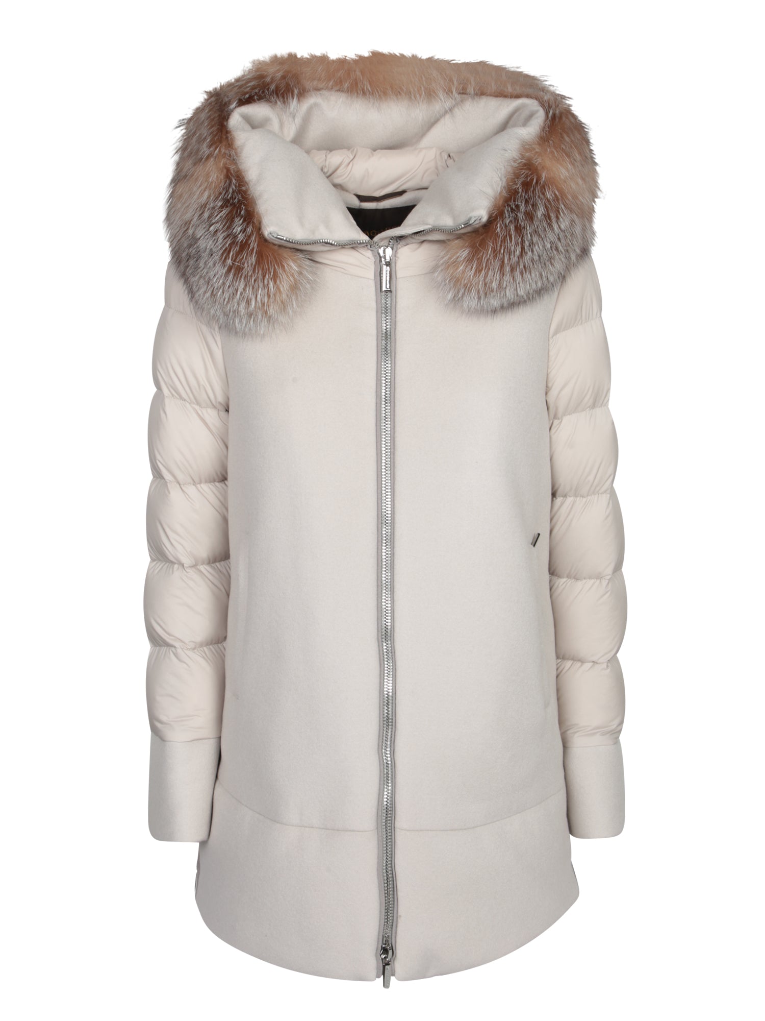 Central zipper closure. High collar with fur trim. Side pockets with zippers.