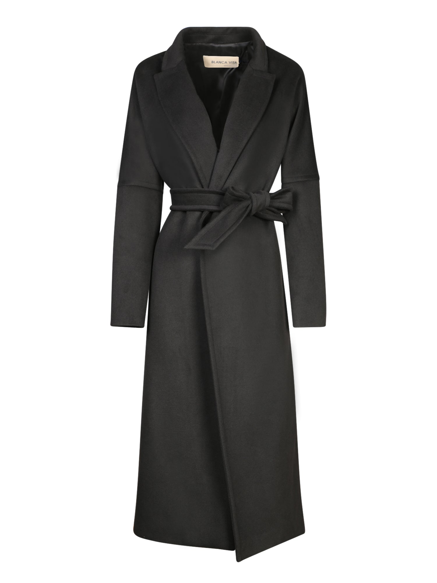 Timeless elegance meets modern functionality in this black coat from Blanca Vita. The structured design and knotted belt accentuate the silhouette, while the wool fabric provides warmth and comfort. Perfect for a sophisticated appearance in formal events
