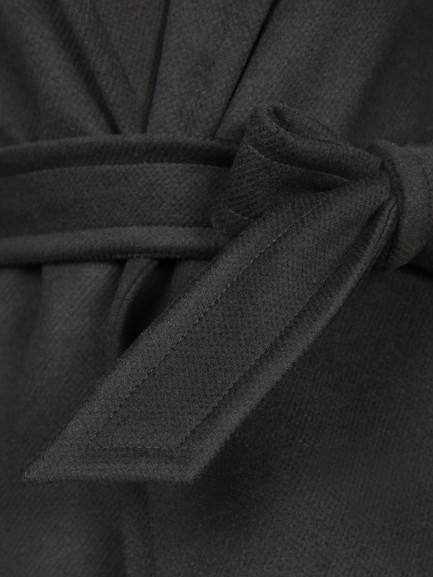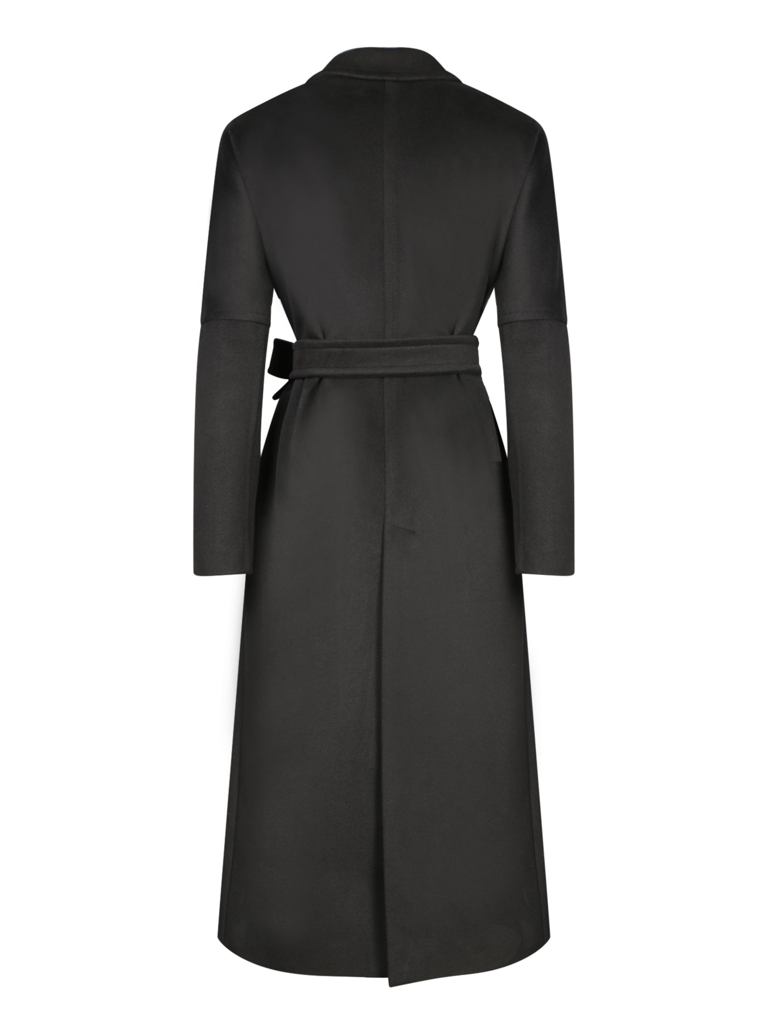 Long wool coat with belt. Wide lapel collar. Side patch pockets.